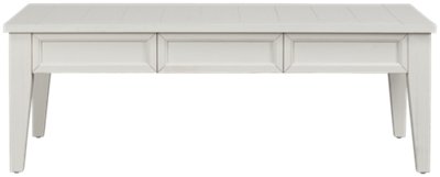 White large rectangle wood coffee table with lift top.